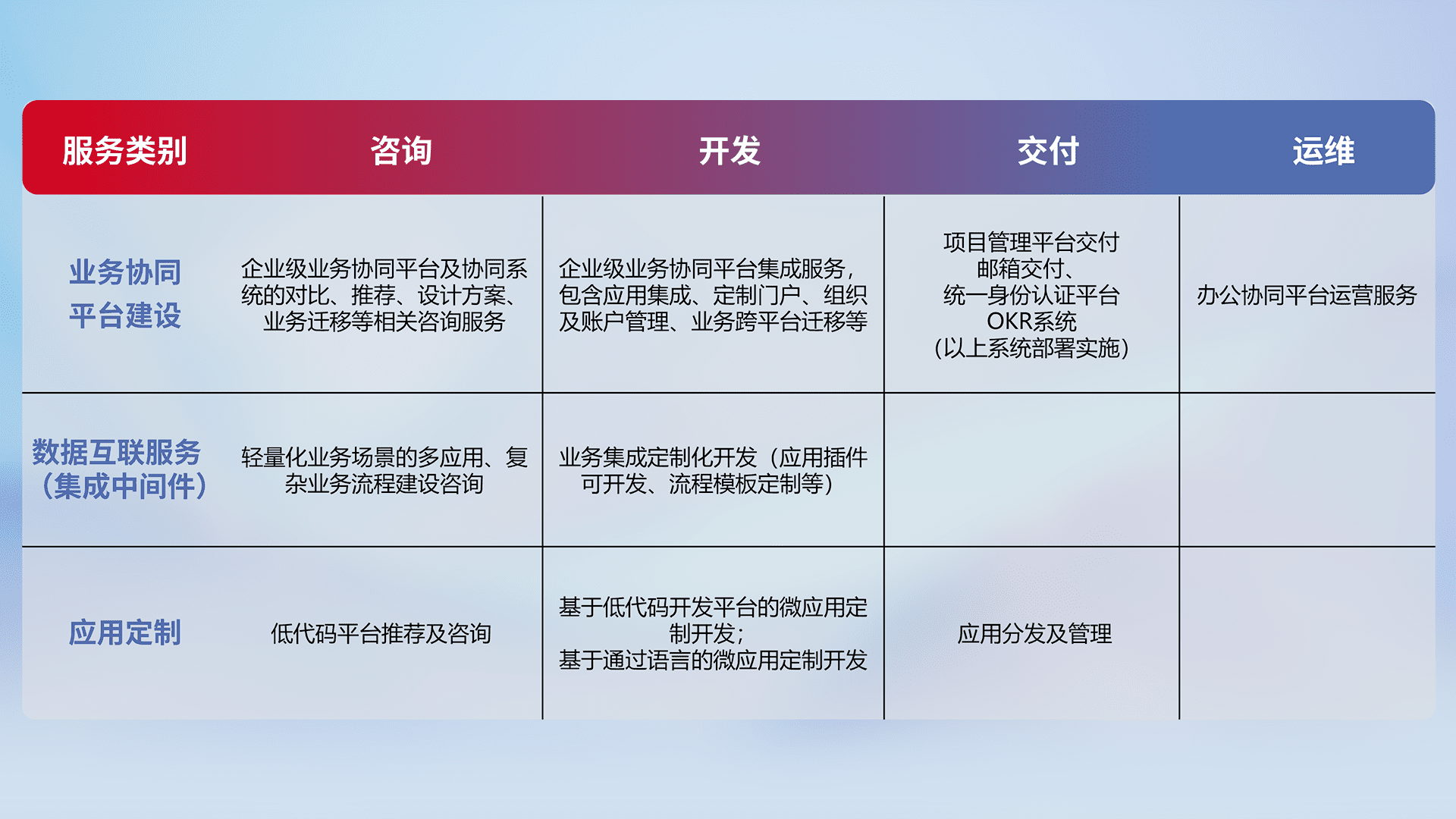 针对钉钉、、企微、、、IDaas等平台级产品提供产品的规划、、方案、、交付、、定制化开发等服务,,,,实现如统一协同办公、、、、智能客户服务、、混合会议管理、、、智能数据查询、、等业务场景,,,,实现数字化转型。。。